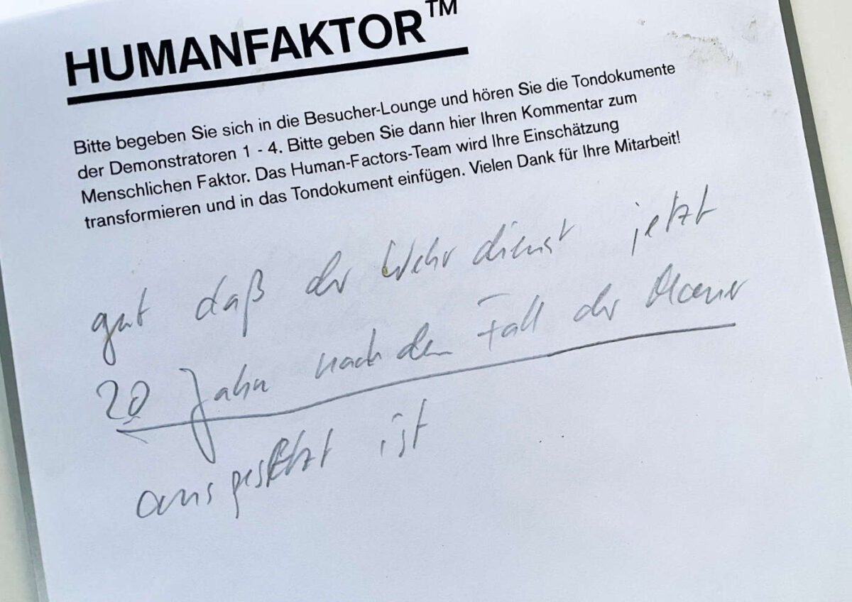 Interviews mit ehemaligen Rekruten der NVA bilden die Grundlage für eine fiktive Rekonstruktion. Im Rückblick auf das Abwesende enthüllt sich eine komplexe Struktur, erzählt als retrofuturistische Geschichte und über Kopfhörer abrufbar. „Der menschliche Faktor“ – boomender Begriff der neueren Wirtschaftspsychologie – bleibt fehleranfällig und letztlich unberechenbar. Drill und Kasernierung repräsentieren ungeliebte Gegenmaßnahmen im jeweiligen Machtsystem. Abgemischt mit vor Ort aufgezeichnetem Klang, wurde das halb dokumentarische, halb fiktive Material zum Soundtrack für die Wahrnehmung der Besucher in den leeren Kasernenräumen.